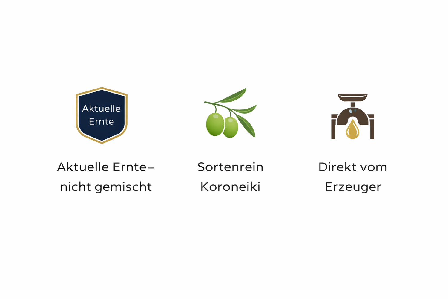 HANDGEERNTET · KALTGEPRESST · SORTENREIN KORONEIKI
